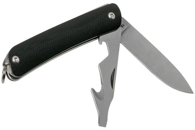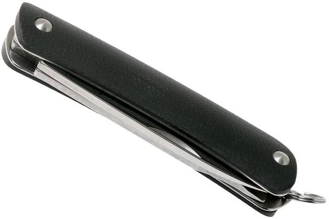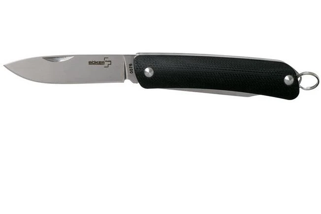 The pocket knives from the Böker Plus Mini Tech-Tool collection might all remind you of the famous Swiss pocket knives. Instead of a traditional red plastic scale these new knives are enhanced with G10 scales. The blade is made from Sandvik 12c27-steel, a stainless type of steel that was specifically developed as a knife steel. The blade is enhanced with a remarkable hollow grind. As such it is thin above the edge, which improves the cutting properties. It doesn’t contain a real lock, but a slipjoint firmly keeps the blade in place when opened. The back of the handle is enhanced with a keyring.